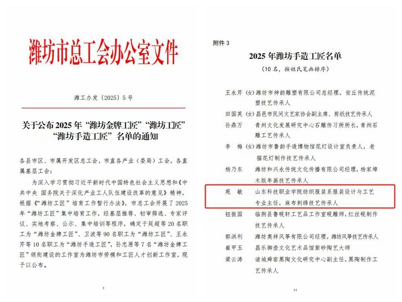 近日,濰坊市總工會公布了2025年“濰坊金牌工匠”“濰坊工匠”“濰坊手造工匠”名單,學校紡織服裝系苑敏獲評“濰坊手造工匠”榮譽稱號。