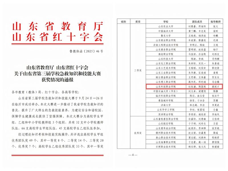 11月7日,山東省教育廳公布第三屆急救知識(shí)和技能大賽獲獎(jiǎng)名單,我校榮獲三等獎(jiǎng)。本次大賽由山東省教育廳和山東省紅十字會(huì)主辦,以“救在身邊,青春當(dāng)先”為主題,旨在全面提升全省各級(jí)各類(lèi)學(xué)校師生的急救知識(shí)儲(chǔ)備、實(shí)操技能水平及應(yīng)急處置意識(shí)。