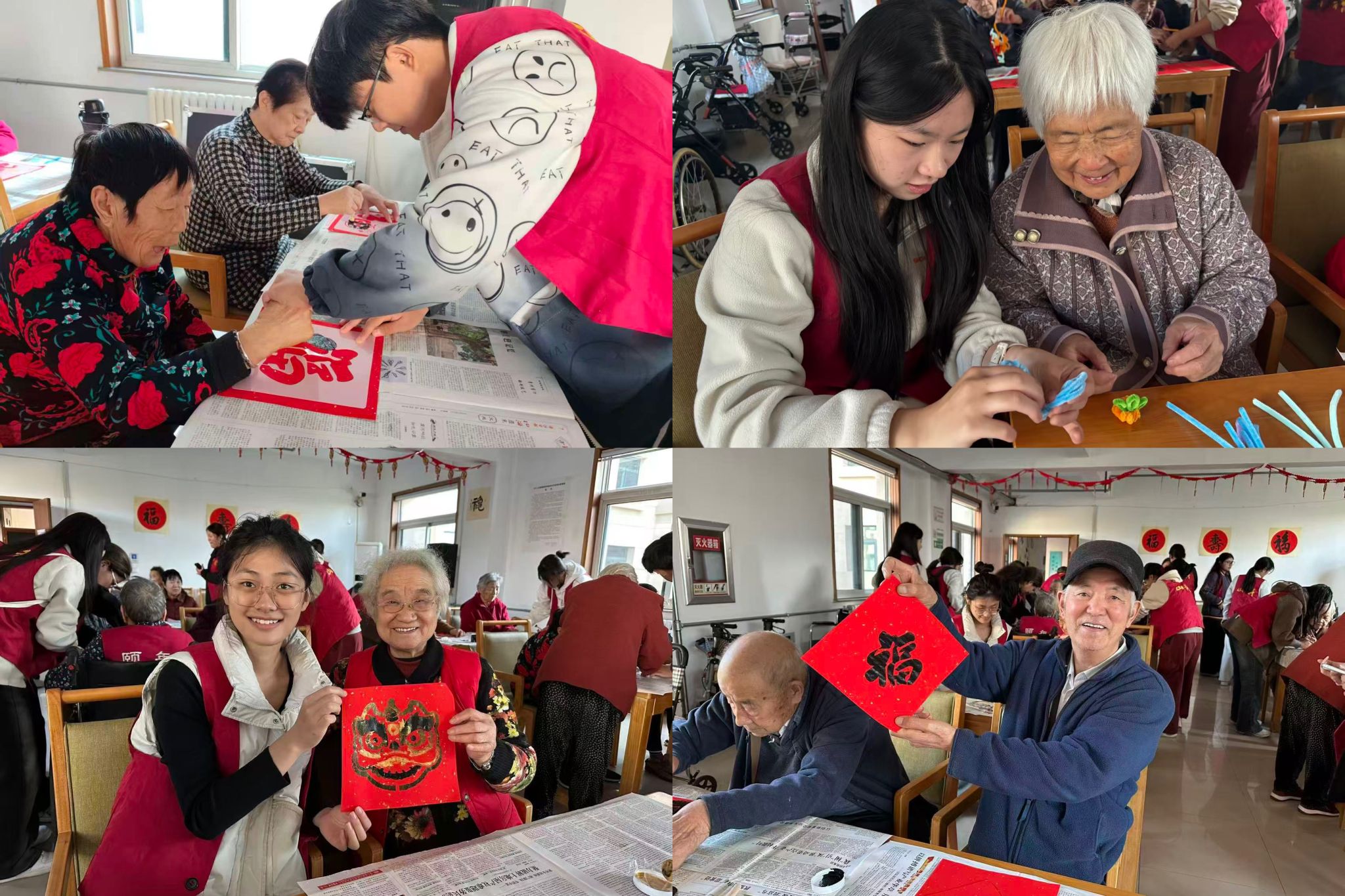 活動前,志愿者精心準備了非遺拓印與扭扭棒手工材料。活動現場,老人們認真挑選鏤空圖板,用海綿蘸取顏料輕輕拓印,紅紙上便躍出金色的“福”字與靈動瑞獅,每一幅作品都凝聚著喜悅與專注。隨后,志愿者們陪伴老人用“扭扭棒”制作手工,五彩的扭扭棒在指尖翻飛,化作柿子、花朵等生動造型。活動現場歡聲笑語不斷,老人們在動手中感受創造的樂趣,在陪伴中體會關懷的溫暖。