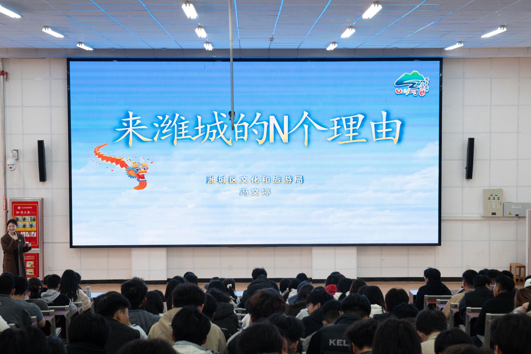 活動在熱烈的掌聲中拉開帷幕。濰城區文旅局的推介官們通過精心準備的PPT和宣傳片,以生動活潑的語言,帶領同學們進行了一場“云游濰城”之旅。推介內容不僅涵蓋了十笏園、濰縣古城墻等承載歷史記憶的文化地標,也介紹了當前熱門的休閑打卡地和特色非遺項目,全面立體地展現了濰城區作為歷史文化名城的獨特風采與時尚活力。